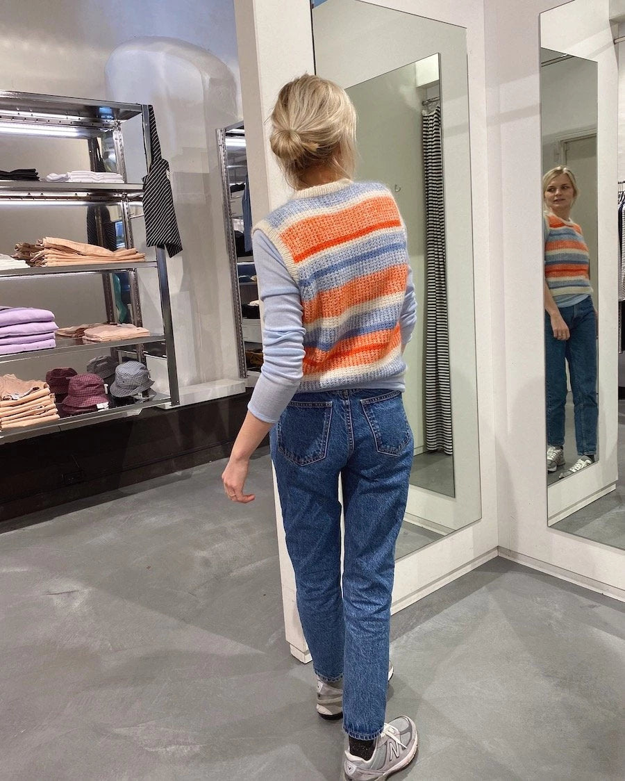 The brown Friday Slipover is knit in Sunday from Sandnes Garn (Camel) and Tynn Silk Mohair from Sandnes Garn (Brunt Sukker).