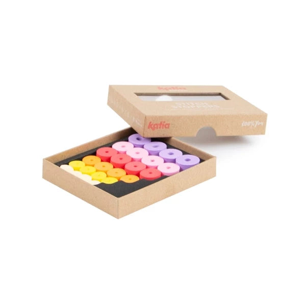 Pehmeät stopperit puikkojen päihin, etteivät silmukat karkaa.. Suositellaan puikoille 2-10 mm. Pakkauksessa on neljä kappaletta jokaista kuutta eri kokoa. Yhteensä siis 24 kappaletta.