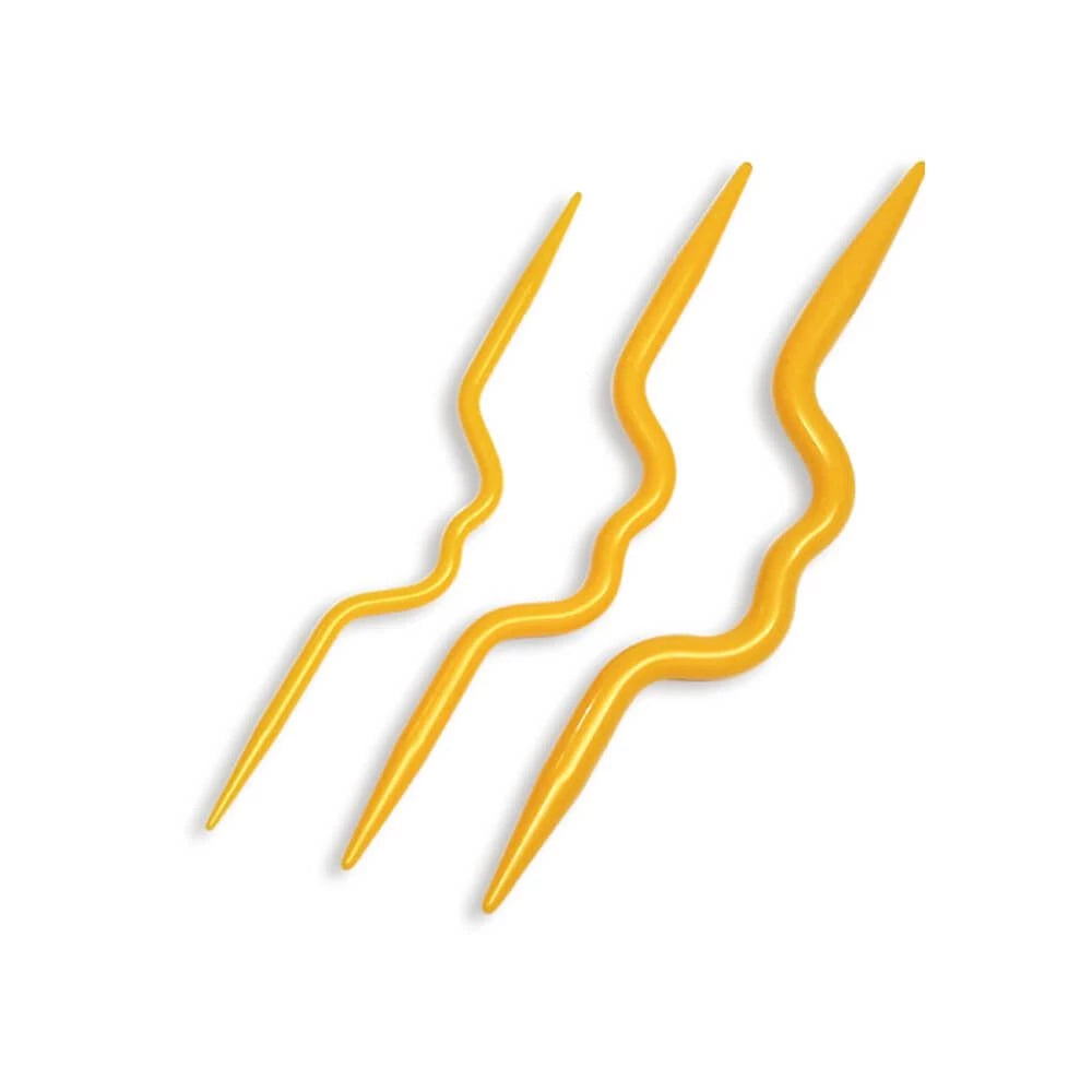 Pakkauksessa on kolme eri kokoista palmikkopuikkoa. keltaiset muovista, vaaleat bambua ja tummat yrttivahattu Koshitsu-bambu.