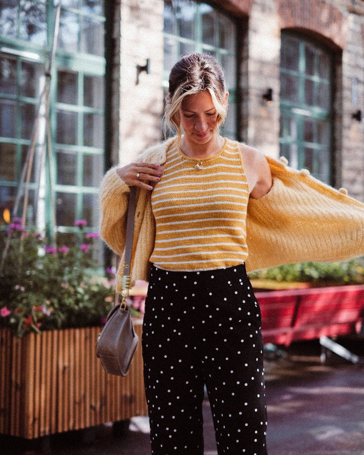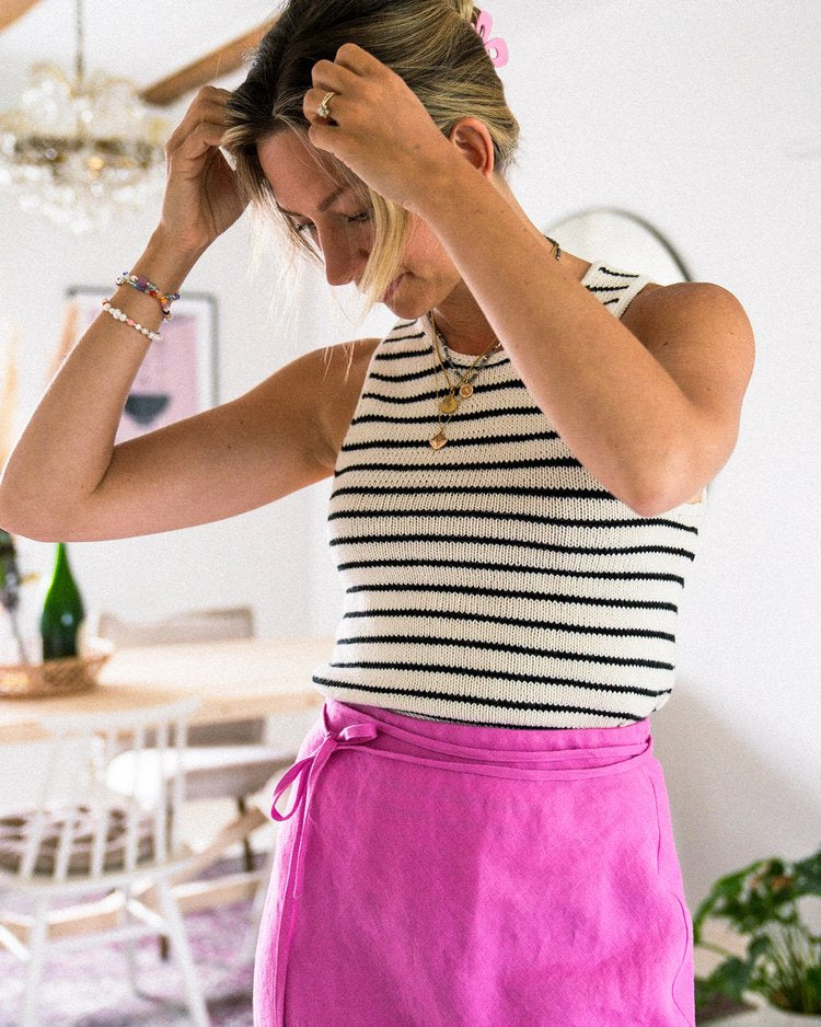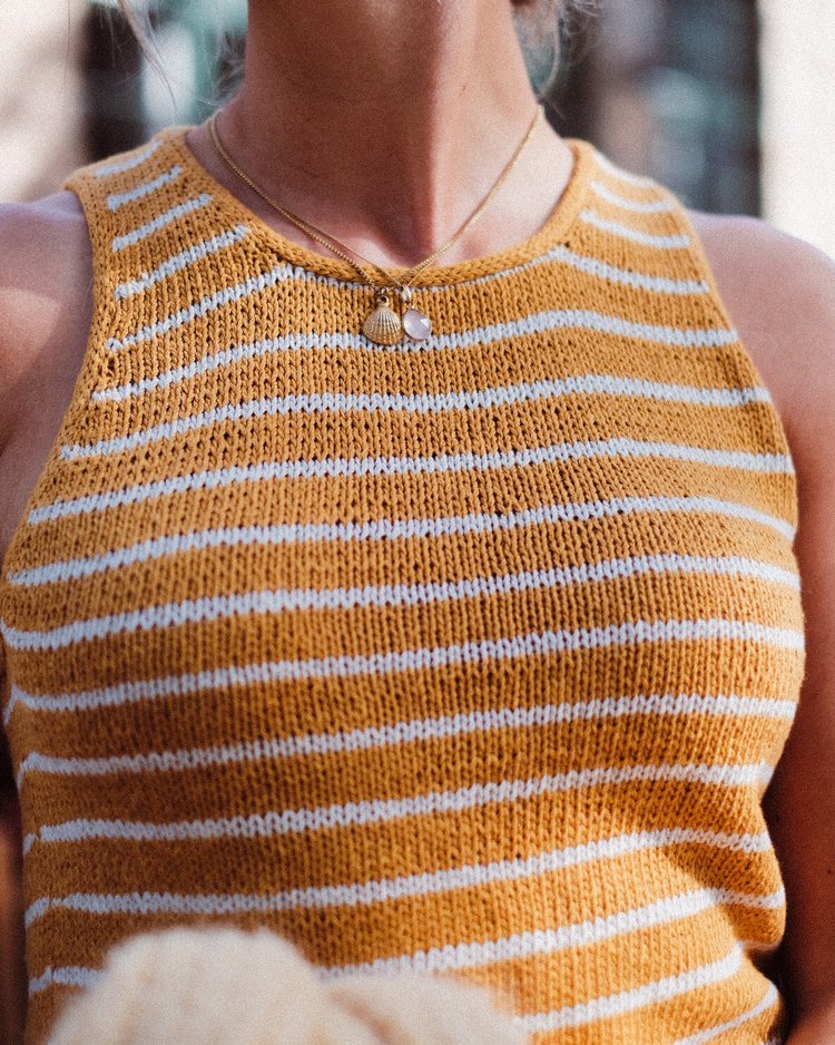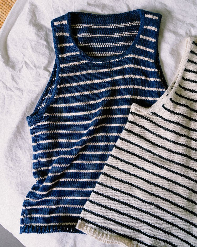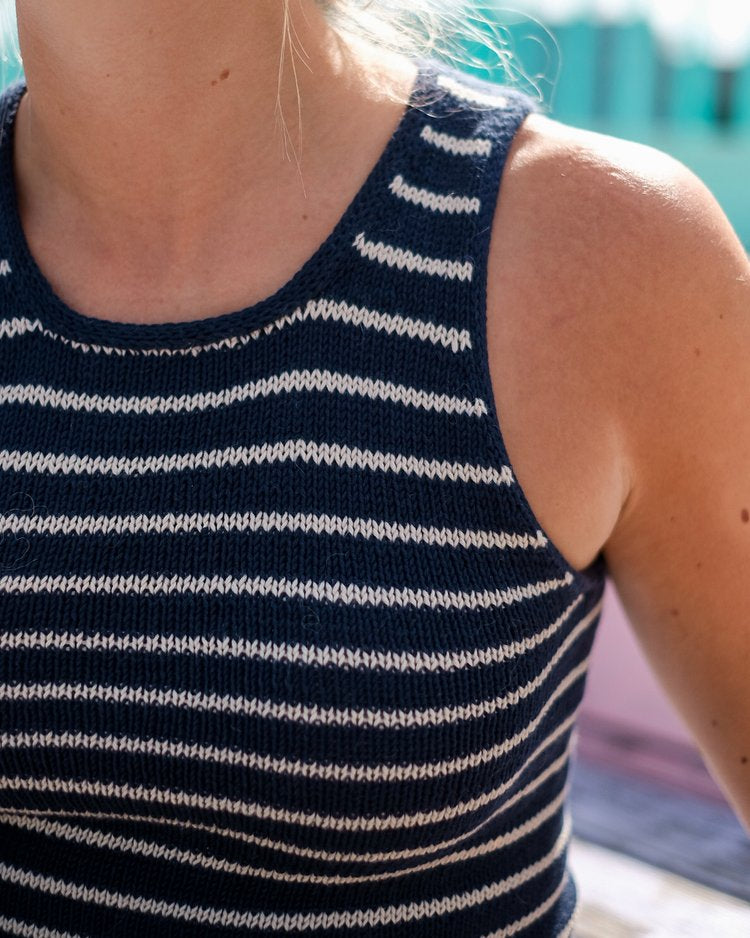 The Sailor Swift Top is a simple tank top with a slight racerback shape that gives it a contemporary look and a slight cool-girl vibe. The classic striped pattern together with the delicate i-cord edges around the neckline and armholes makes this a true wardrobe favorite that you’re going to want to wear (and knit) again and again.