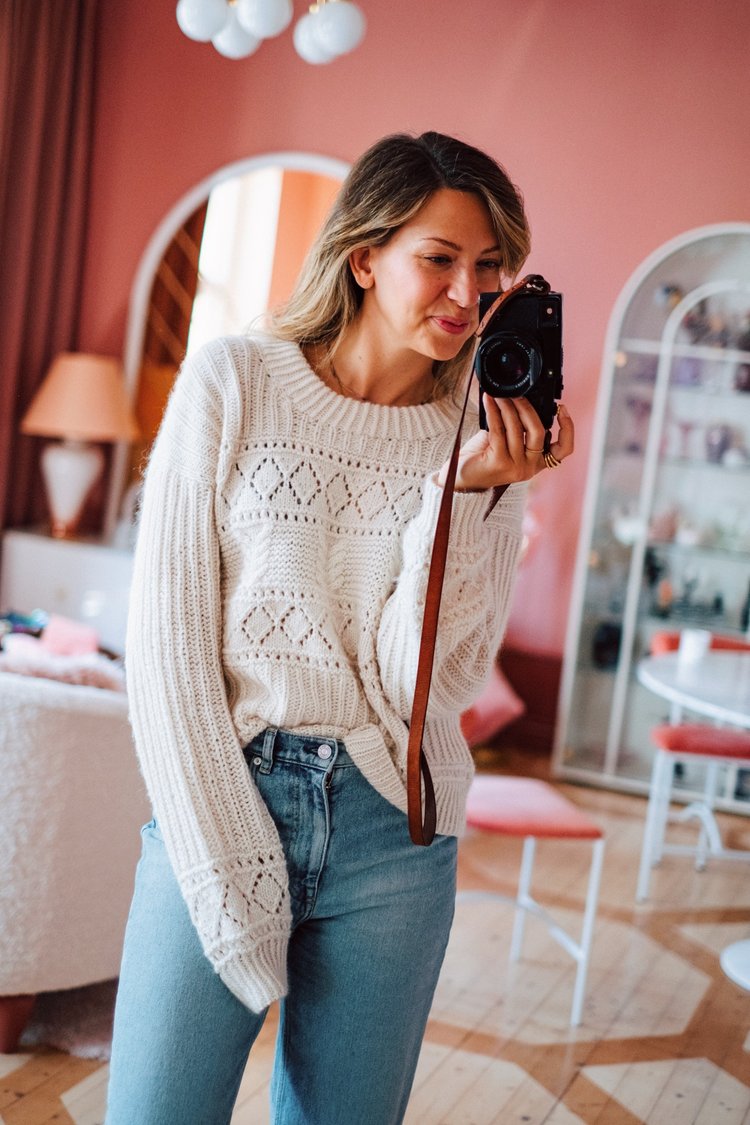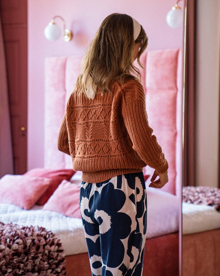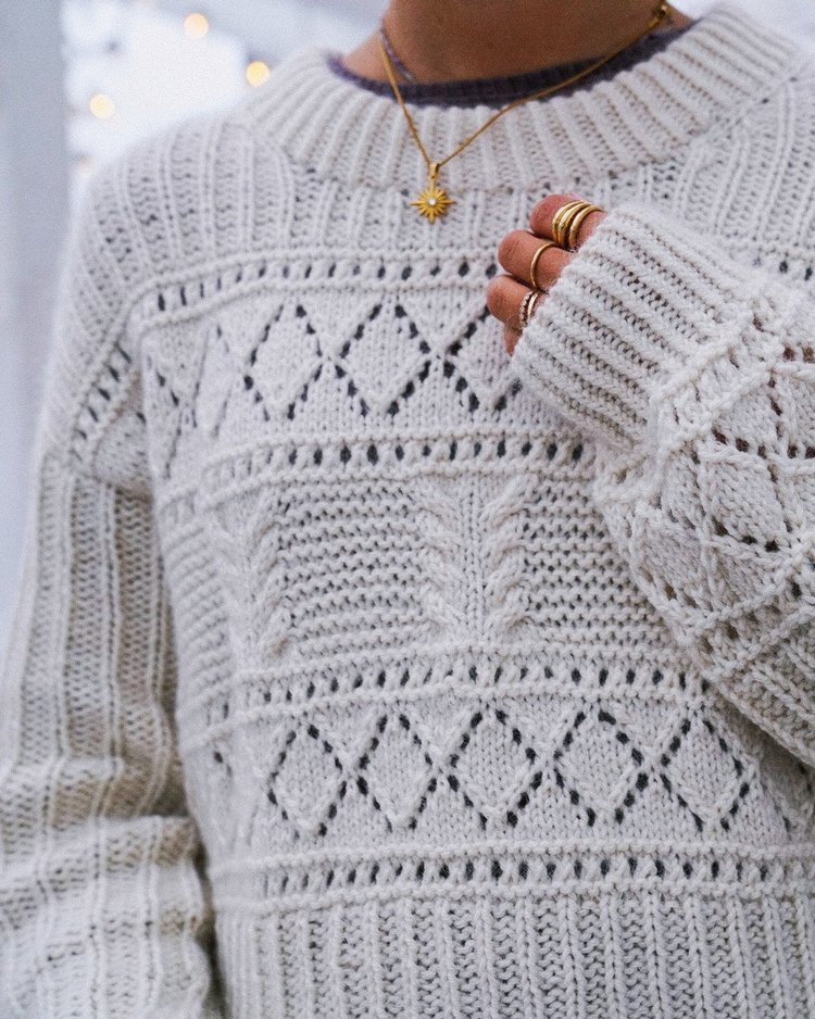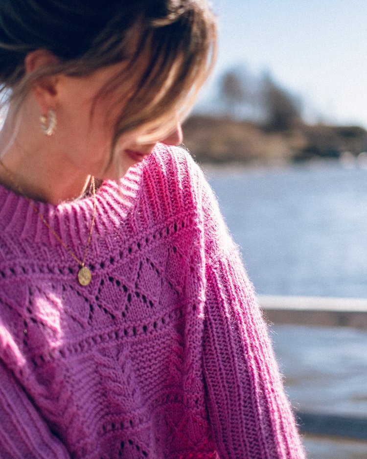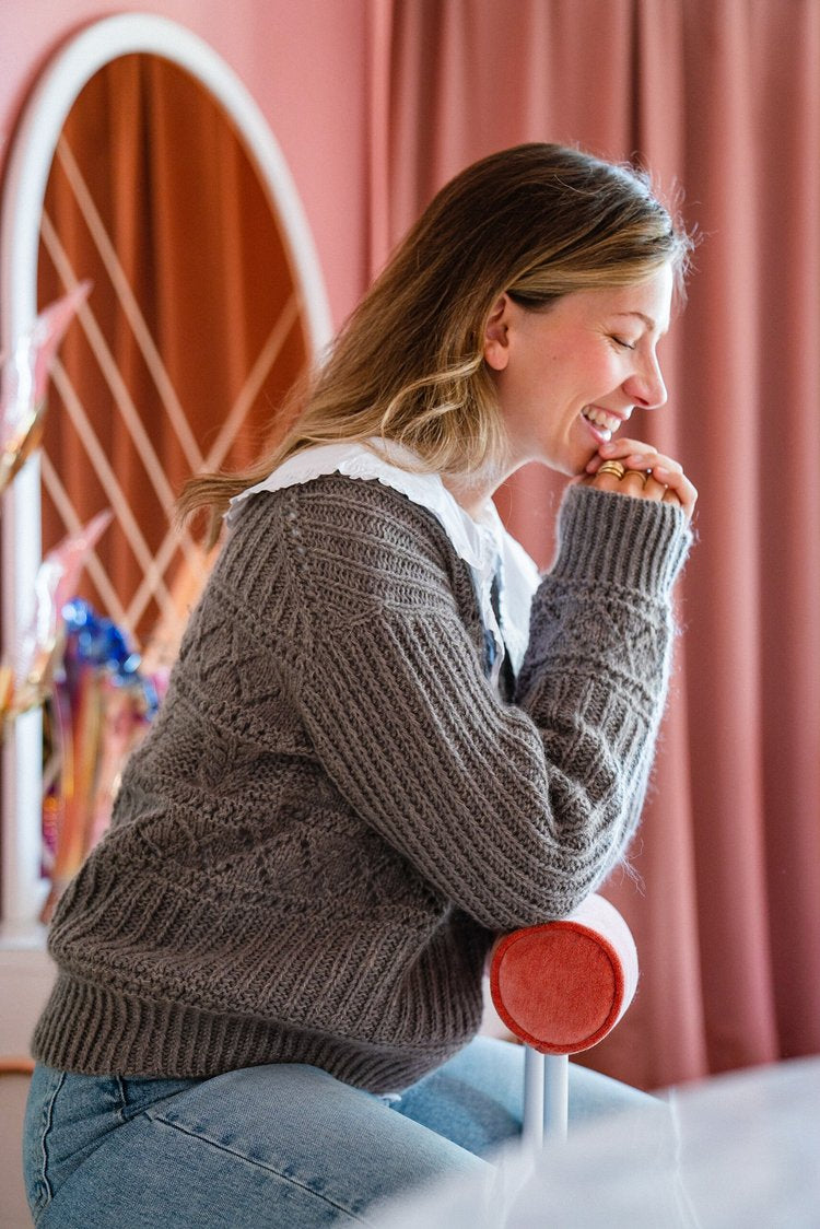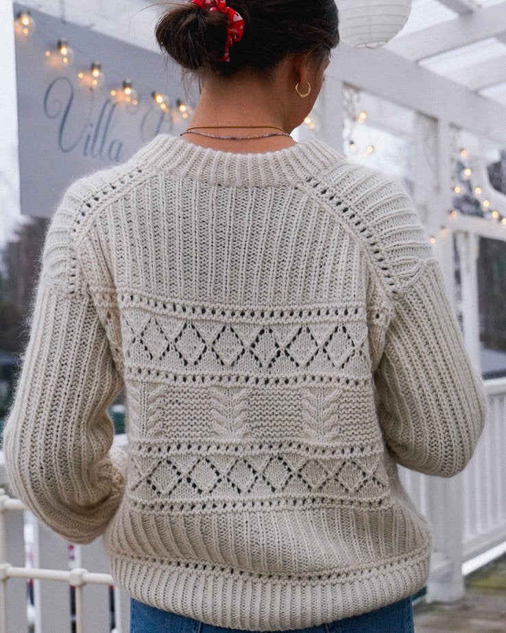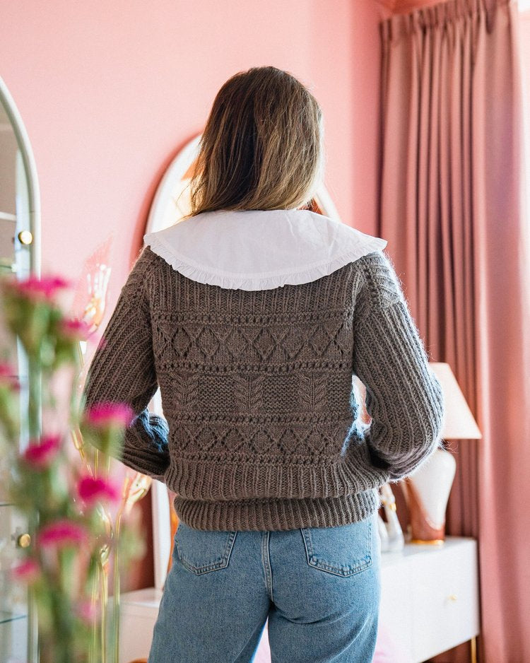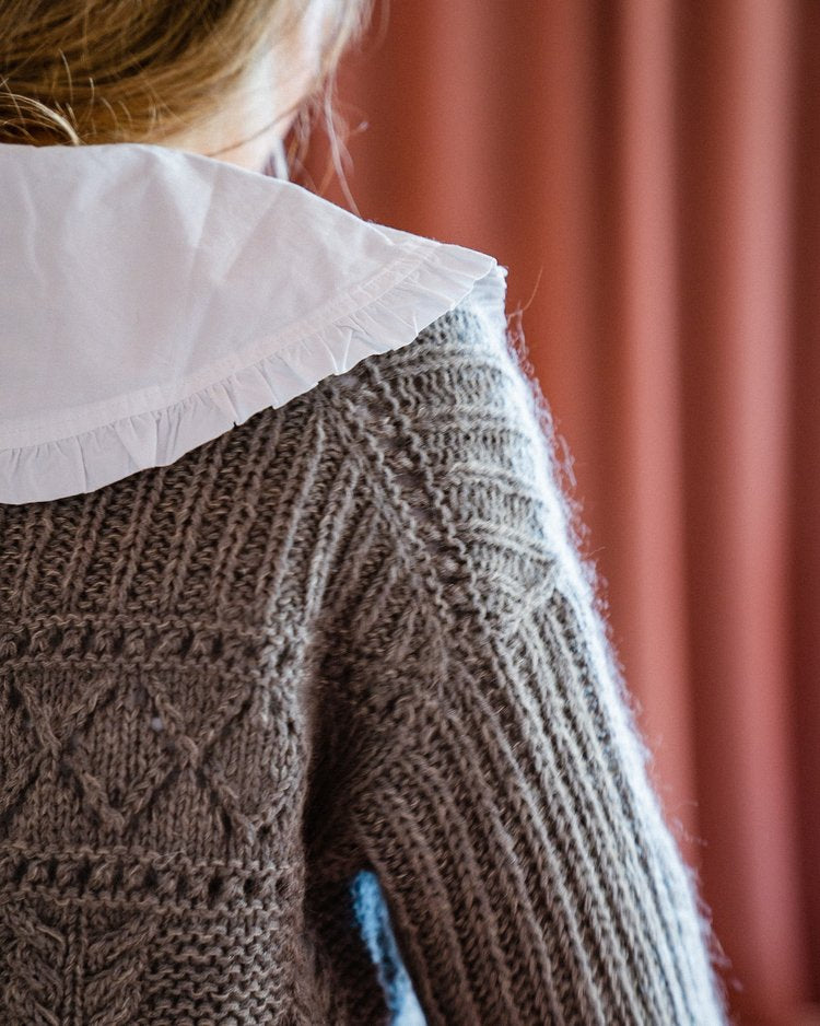 The sweater is worked top down and has a dropped shoulder with extra-long sleeves for a feminine and cozy look. The work begins by shaping the back yoke flat while increasing for the shoulder seams, then stitches are picked up from the right and left shoulder for the front yoke. The front and back yokes are then joined together and worked in the round for the body. Stitches are picked up for the sleeves and worked in the round, and lastly stitches are picked up for the double folded collar.