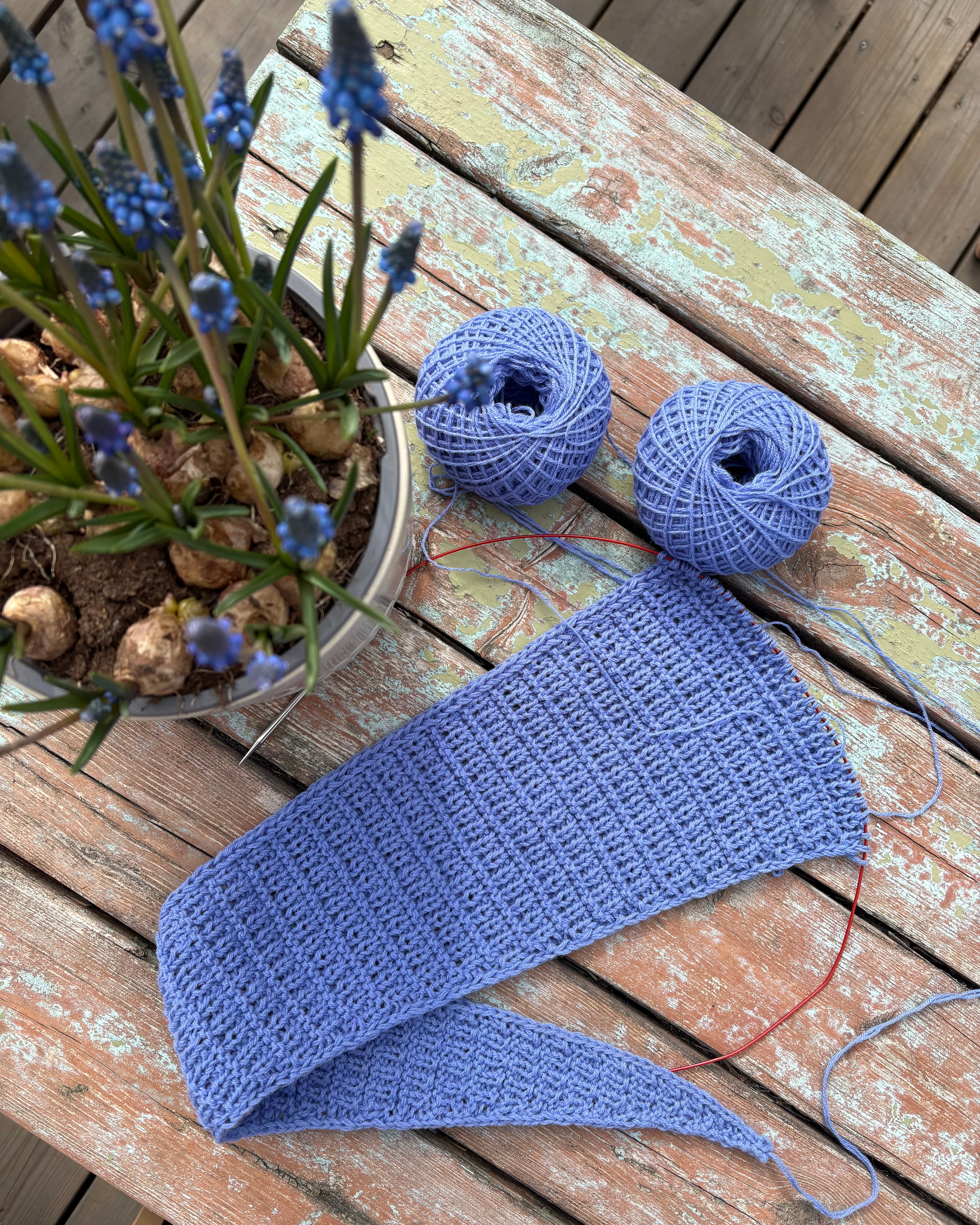 is knitted with two strands of Knitting for Olive Merino (100% merino - 250m/50g) in the color Lavender Blue held double.
