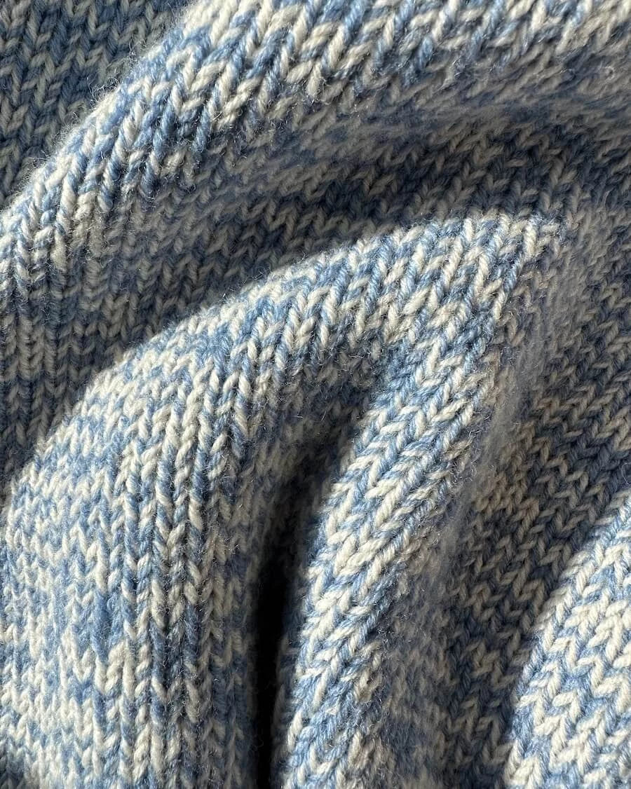 The blue and white Melange Sweater Junior is knitted in Sunday by Sandnes Garn in the colors Baby blue eyes [6043] and Whipped cream [1012].