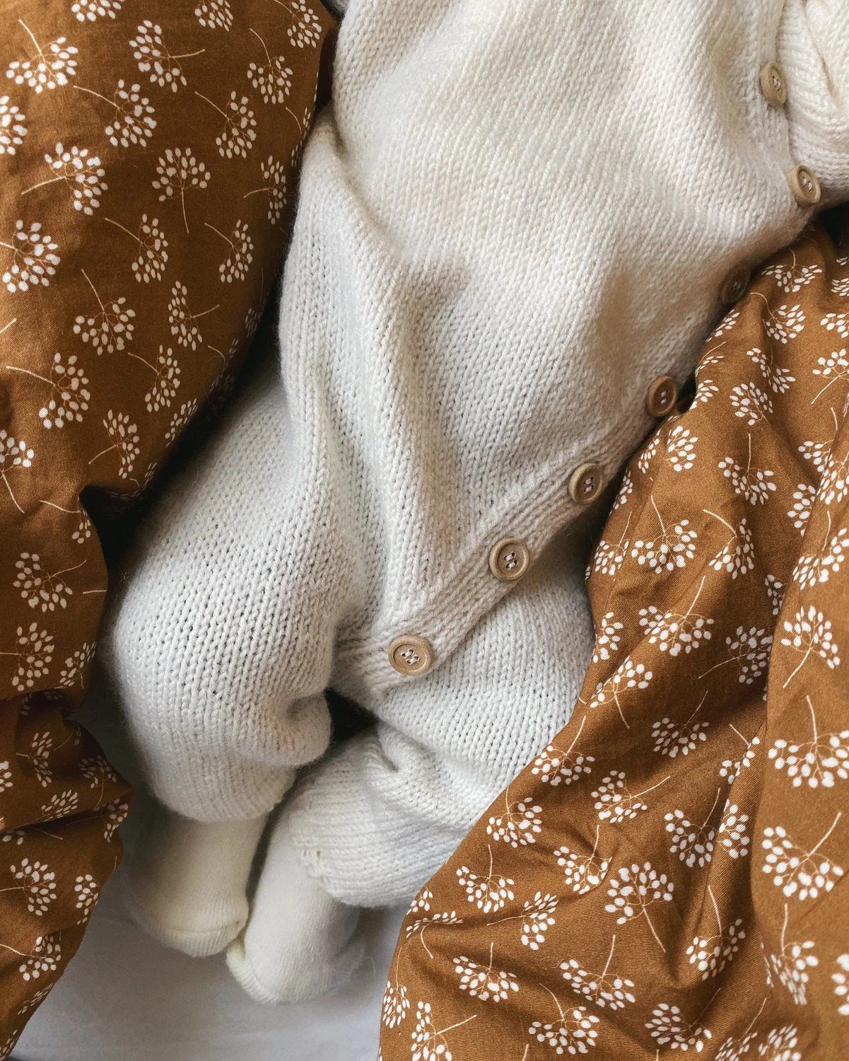 The Monday Suit is worked from the top down with raglan increases on the yoke and a button placket along the left front raglan. The button placket continues down the body and slants in towards the crotch. The yoke and body are worked back and forth on a circular needle, while the sleeves and legs are worked in the round either on double-pointed needles or on a circular needle using the Magic Loop technique.