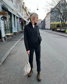 The grey Zipper Sweater Light is knitted in Peer Gynt by Sandnes Garn in the color Koksmelert [1088].